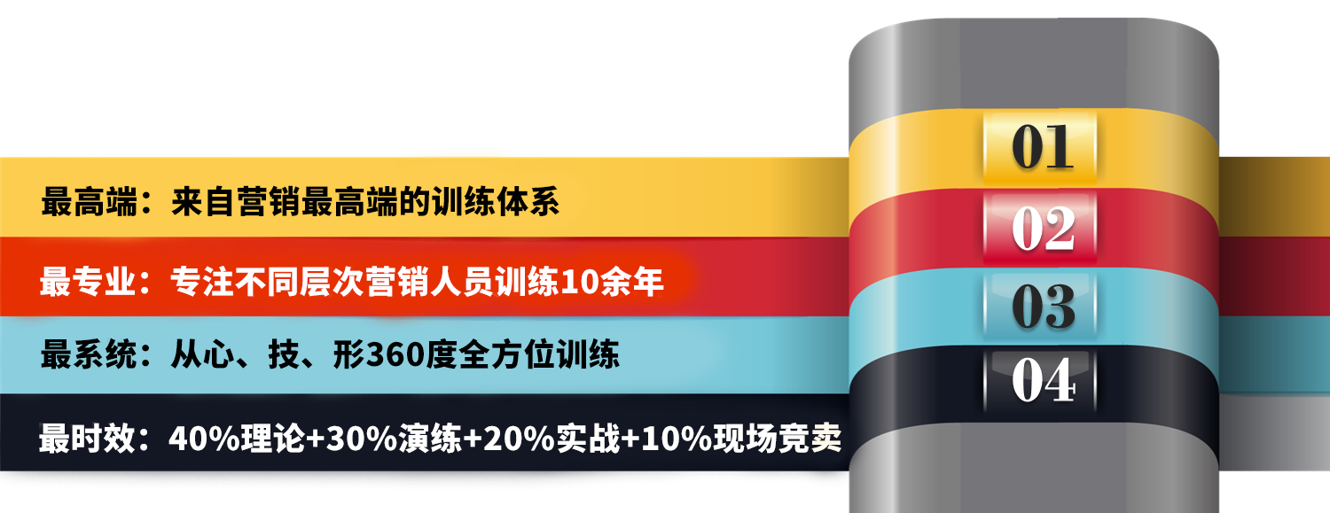 | 引爆?靈動能 | 2天1晚 | 19800/場 | 1、3個?系統(tǒng)性、浸泡式學習; 2、3個?運?輔導,幫助學員全?銷售能?提升; 3、2套價值1000元的銷售、談判光盤供學員復習鞏固; 4、協(xié)助參訓學員編寫價值 5000 元的《話術?冊》并指導使?; 5、不定期落地分享會與會員企業(yè)互訪等主題活動等. |