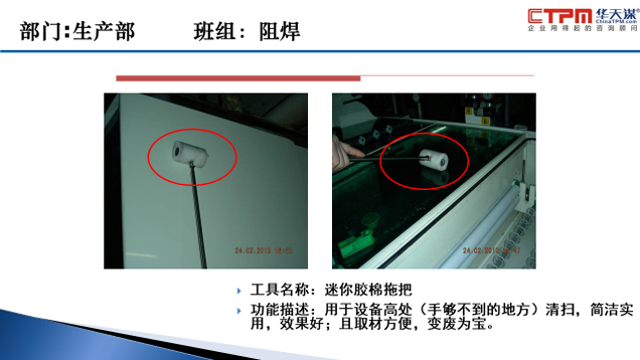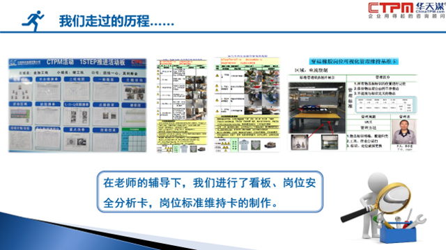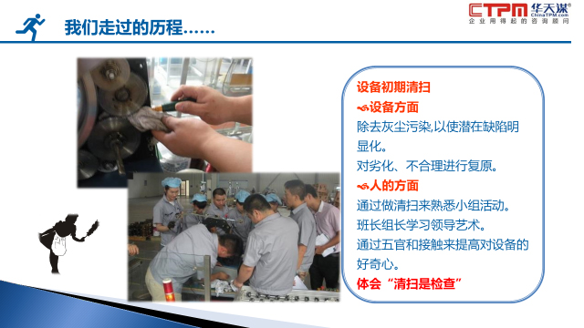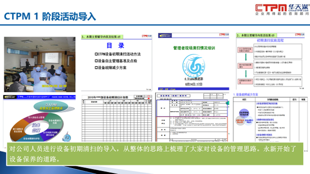 設(shè)備全面維護(hù)及管理體系建立全面清掃設(shè)備、制作專用設(shè)備清掃工具,解決設(shè)備清掃死角,制定機(jī)器操作標(biāo)準(zhǔn)、點(diǎn)檢標(biāo)準(zhǔn),使員工操作得到有效管理、機(jī)器得到有效保養(yǎng),為下一階段進(jìn)行設(shè)備改善打好基礎(chǔ)。