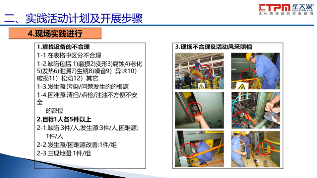 全員參與設(shè)備管理的方法通過“設(shè)備初期清掃活動(dòng)”,全員參與了解設(shè)備的結(jié)構(gòu),學(xué)習(xí)設(shè)備知識(shí),查找設(shè)備上缺陷、跑冒滴漏問題點(diǎn),并親自參與改善。設(shè)備清掃活動(dòng)中,員工自己繪制設(shè)備三現(xiàn)圖,識(shí)別設(shè)備對產(chǎn)品影響的關(guān)鍵部位,制定設(shè)備清掃標(biāo)準(zhǔn)。