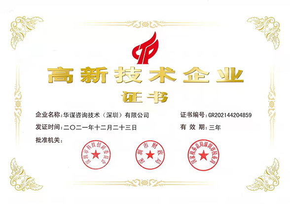 根據(jù)國家《高新技術(shù)企業(yè)認(rèn)定管理辦法》《高新技術(shù)企業(yè)認(rèn)定管理工作指引》的有關(guān)規(guī)定,華謀咨詢技術(shù)(深圳)有限公司憑借團(tuán)隊專業(yè)技術(shù)研發(fā)能力、持續(xù)創(chuàng)新能力和企業(yè)管理能力,順利通過由科技部、財政部、稅務(wù)總局組織的國家高新技術(shù)企業(yè)認(rèn)定,目前,華謀咨詢技術(shù)(深圳)有限公司是國內(nèi)管理咨詢領(lǐng)域內(nèi)獲得國家高新技術(shù)企業(yè)認(rèn)證的企業(yè)。