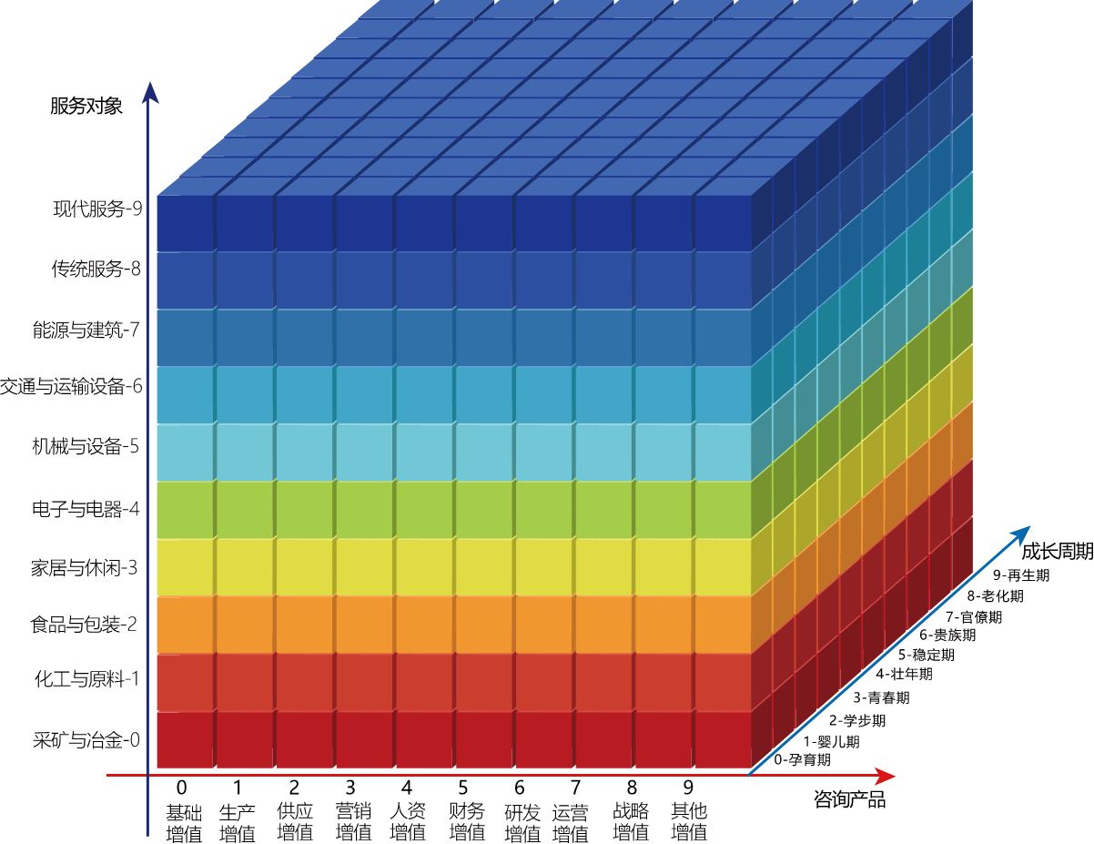 X軸代表十橫咨詢服務(wù)產(chǎn)品、Y軸代表十縱咨詢服務(wù)對象、Z軸代表非自然生命體生命周期。